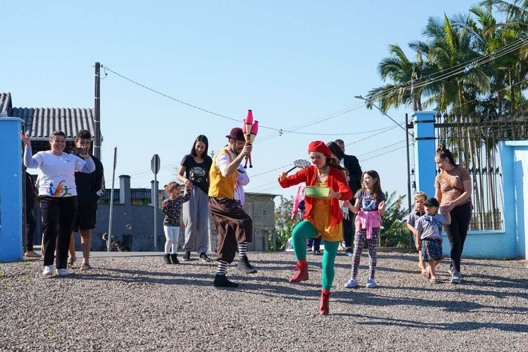 Evento: 3ª mostra de teatro e circo de rua “Dona Nita”. O evento é uma realização da Fundação Municipal de Cultura de Balneário Piçarras e tem como objetivo levar um pouco de diversão às famílias, através de apresentações itinerantes por todos os bairros e localidades interiores do município. Apresentação: Cia Circo Nós. | Data: 22.07.2025 – Local: Conceição – Balneário Piçarras (SC).